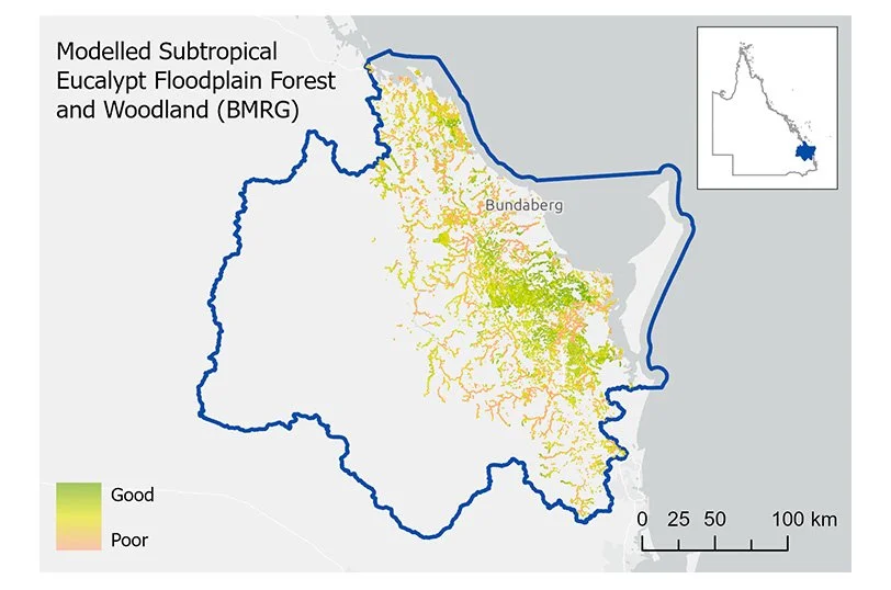 BMRG’s modelled distribution of the Subtropical Eucalypt Floodplain Forest and Woodland, incorporating regional datasets and habitat condition. Areas of higher-quality habitat are shown in green, while degraded areas are highlighted in peach.